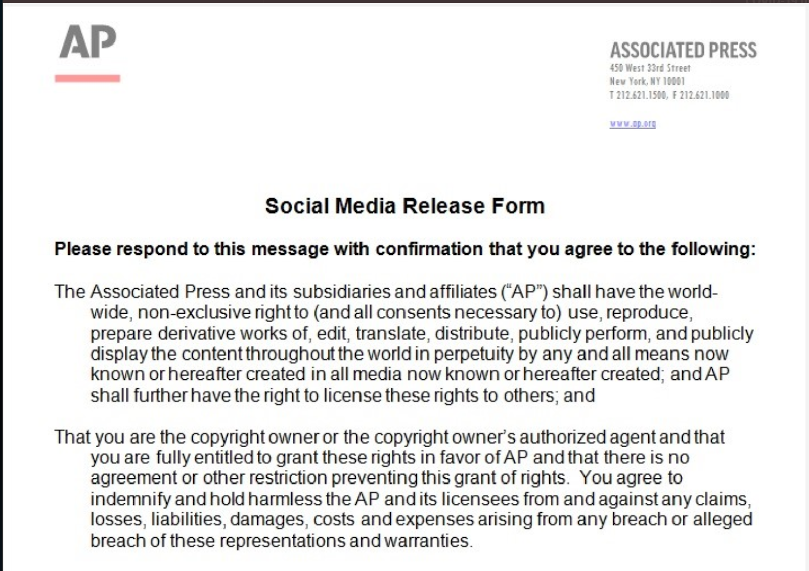 I hope, if you've read through to this point, that this convinces you to AT LEAST read these things carefully if you are ever asked to agree to them, and to contact a lawyer - or just say "no" - if you are in any doubt as to whether you want to agree to a lot of terms and conditions in order to give news stations something of value in exchange for nothing.